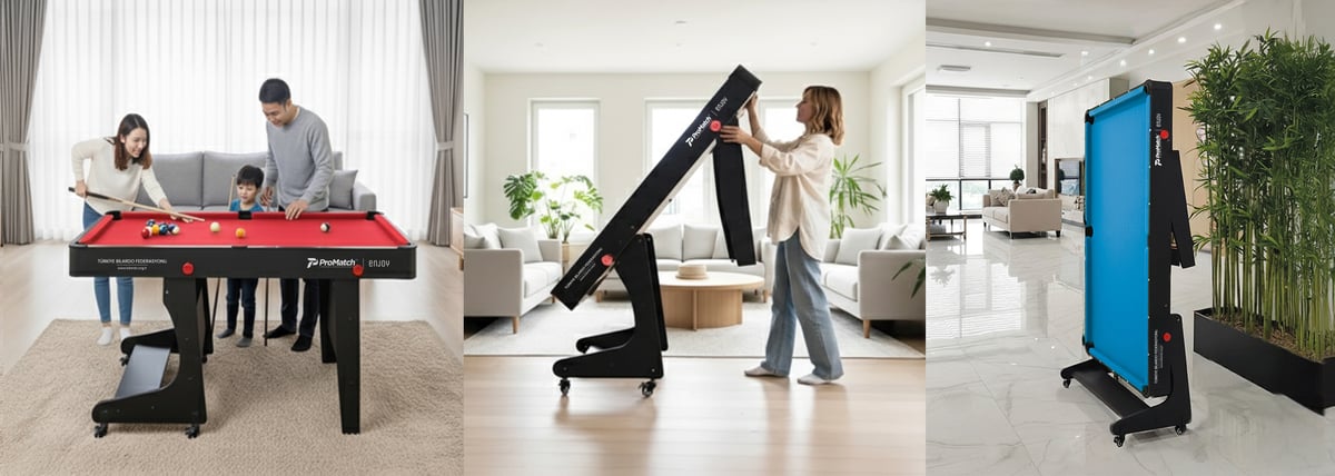 ProMatch olarak, bilardoyu herkes için daha erişilebilir kılmak amacıyla geliştirdiğimiz katlanabilir, taşınabilir ve yer kaplamayan bilardo masamız ile tanışın. Evde, ofiste ya da sosyal alanlarda kullanabileceğiniz bu masa; şık tasarımı, kullanıcı dostu yapısı ve teknik donanımıyla öne çıkıyor.